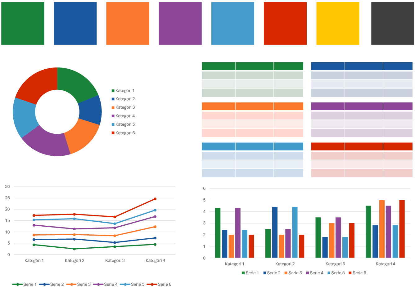 Office krever en palett på minimum seks farger, hvor tints og shades genereres automatisk. Rekkefølgen bestemmer hvordan grafene ser ut, og det er derfor nødvendig med gode kontraster. Her kommer tilleggsfargene inn.