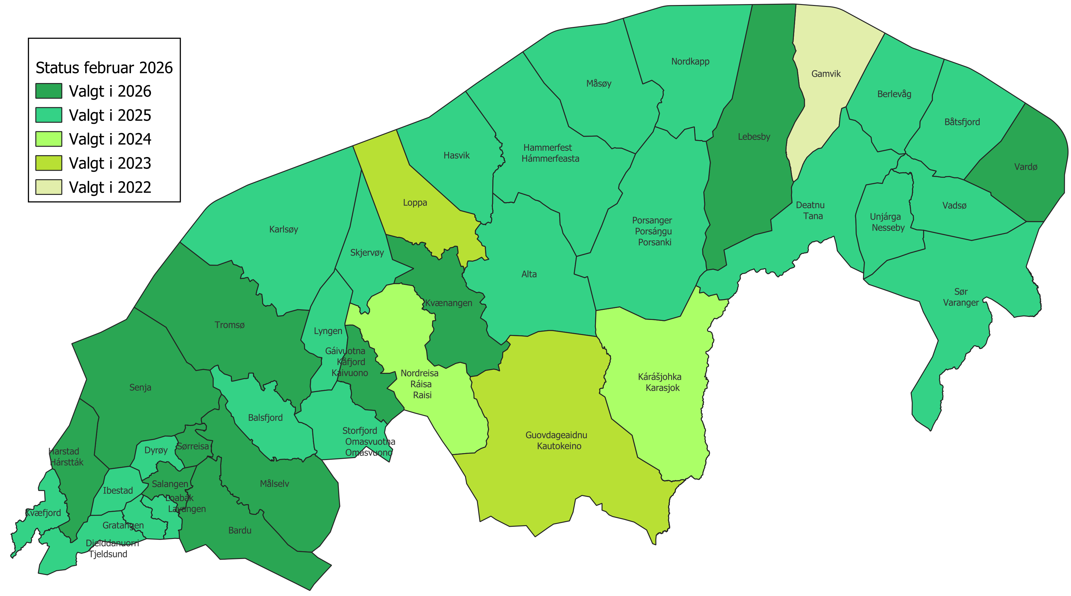 2 kommuner i Finnmark (11 prosent) og 7 i Troms (33 prosent) har allerede valgt DOK for 2026. Totalt, for begge fylkene, utgjør det 87 prosent.
